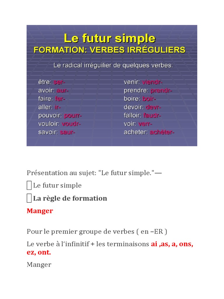 Verbe Manger Au Futur - Le Futur Proche The Immediate Future Ppt Le Futur Proche The Immediate Future Tense Means U201ci Am Going To U2026 U201d Eg Tomorrow I Am Going To Do My Course Hero - Check spelling or type a new query.